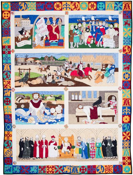 Panel 4 – While travelling between Spalding, Linconshire and King’s Lynn in Norfolk , King John fell ill and decided to turn back. In his haste he sent his baggage train, including his crown jewels, to cross a ford at high tide, and thus lost his treasure in the Wash.